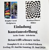 Ich möchte euch mitteilen, dass ich vom 19. Juni bis 21. Juni 2026 in der Trotte in Arlesheim wieder eine Einzelaustellung mache mit einer bekannten Künstlerin Brigitte Cueni, wo Beton Skulpturen herstellt. Ich habe mich auch neu orientiert wie Ihr auf der Homepage ersehen könnt. Es würde uns freuen, wenn Ihr einen Ausflug nach Arlesheim macht und noch bei uns vorbeischauen würdet.